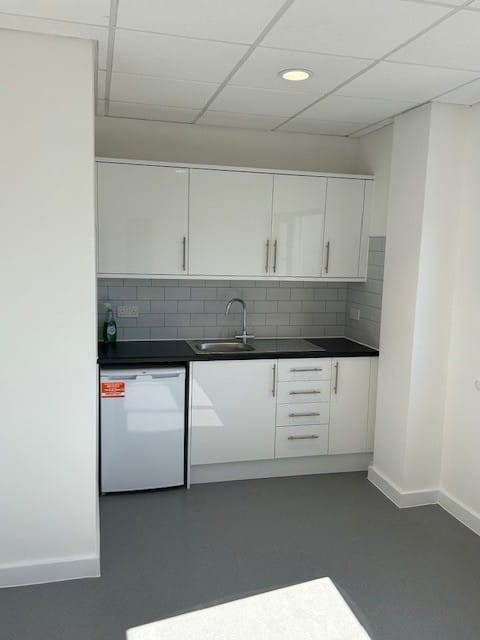 The first floor offices benefit from a kitchenette, carpeting, LED lighting and suspended ceilings.
