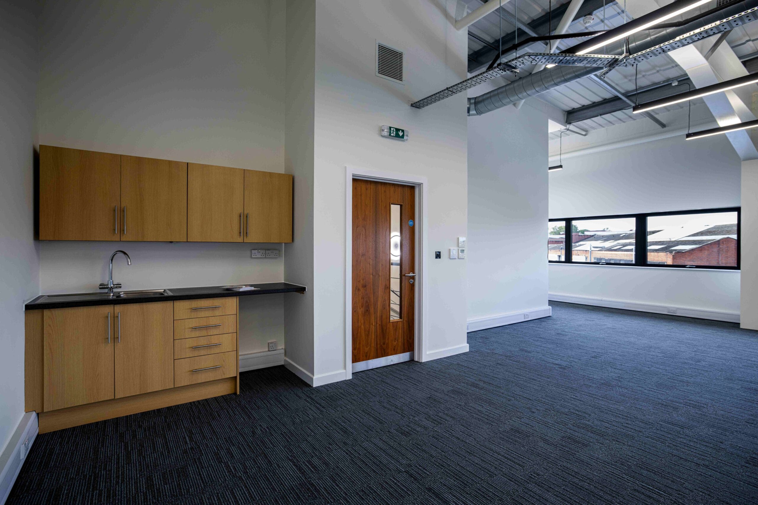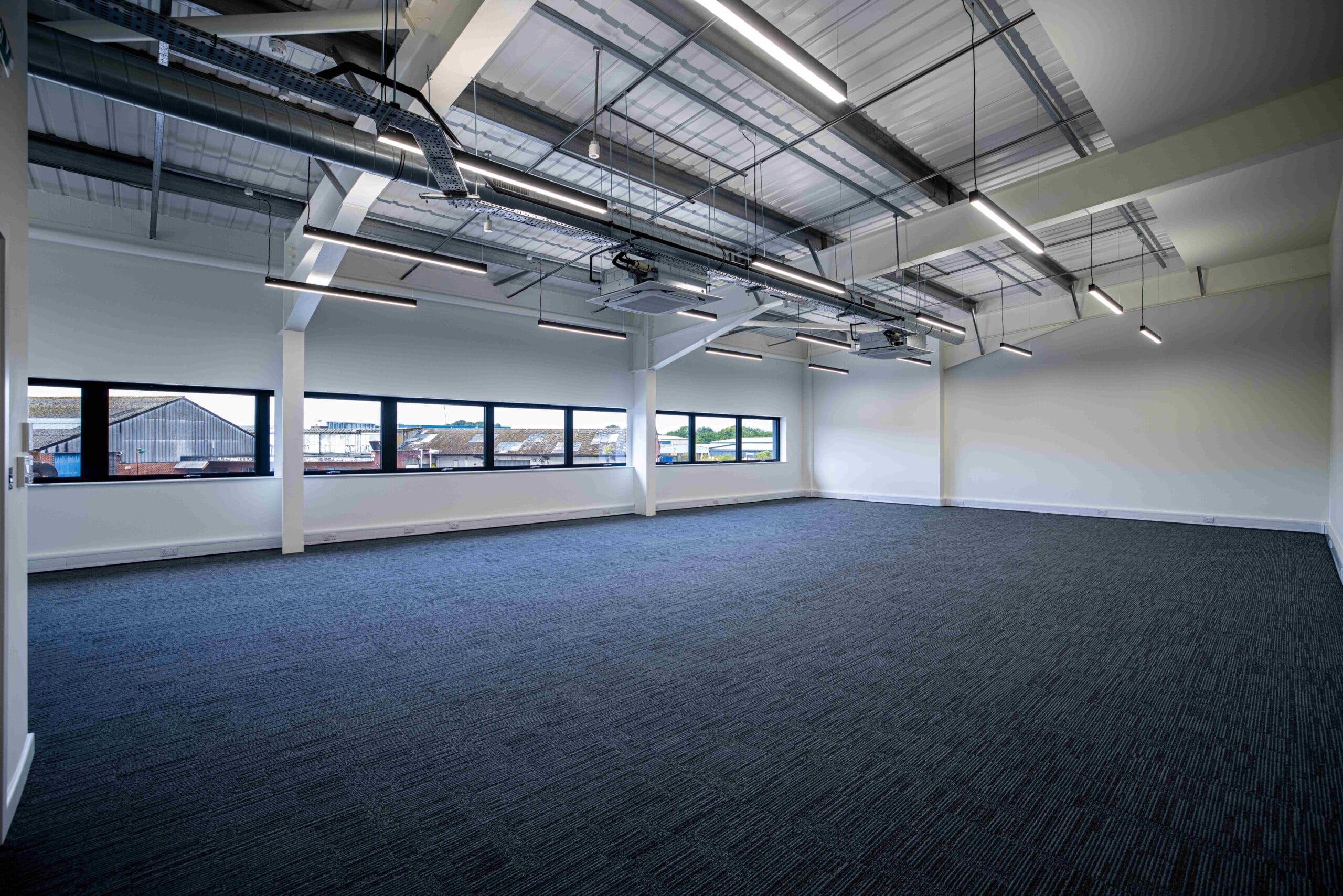 The offices are arranged on ground and first floor and are finished with carpeting, suspended ceilings, LED lighting, dual cooling/heating.